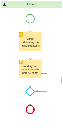 The second activity, Loading and processing the next 50 items, includes a script that is used to process one “chunk” of items: