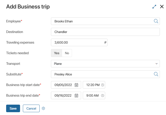 When you create a substitution, you need to specify the employee who is going to be absent, the substitute, and the dates of the business trip.