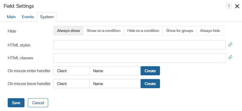 Moreover, all widgets have system events, On mouse enter handler and On mouse leave handler. They can usually be found on the System tab in a widget’s settings.