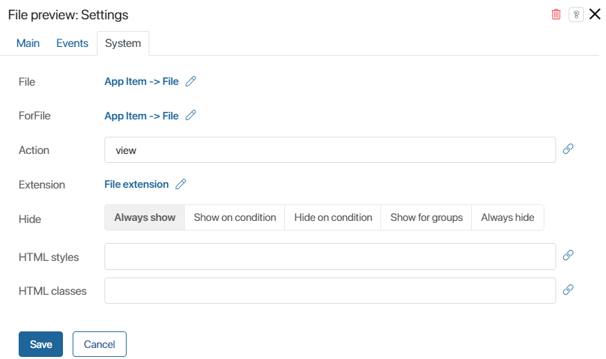 SupportedFileTypes. Note that this property name is mandatory, as it is checked when searching for modules for the file preview extension point. As values, enter the file formats that the module will display, for example, ppt, pptx, and odp.onInit(), and the function for checking the display conditions, by defaultcanRender(). Read more in the BRIX Help Center in the System functions in widgets article. For example, you can set a condition so that the widget isn’t displayed if the file format is undefined:async function canRender() { // Retrieve the file format using a custom function const fileType = getFileType(); // If the file format is undefined, the widget template should not be displayed if (!fileType) { return true; } return false; }linkin the widget’s context. It will store the link to the file and pass it to the template.Go to the Template tab and drag the Code widget onto the form. Insert HTML code into it, which will display a link for downloading the file: